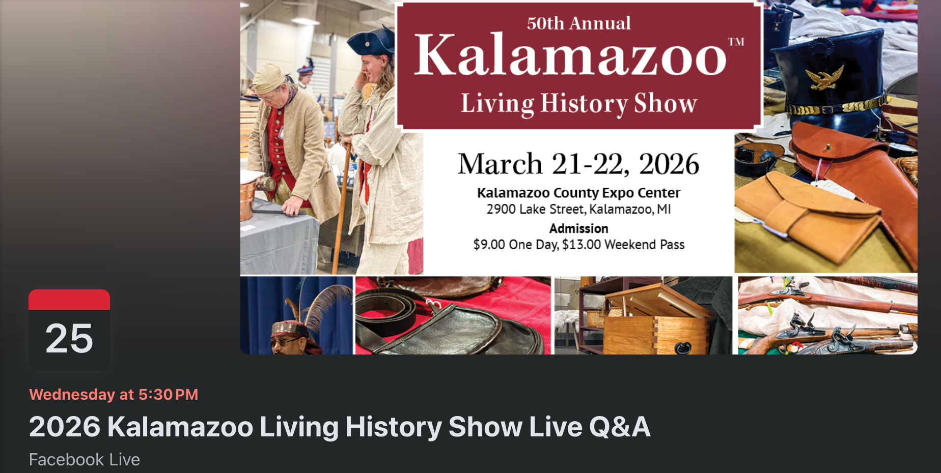 In an effort to answer the questions we are getting from new vendors and new attendees, we’re hosting a Live Q&A about the upcoming Kalamazoo Living History Show February 25 at 5:30pm. We expect it to last about 1 hour, or so, depending on the questions.